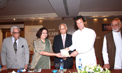 Seen at the launch are (from l to r): Ameena Saiyid, Managing Director, Oxford University Press Pakistan; the Chief Guest, Imran Khan; and Brig. Muhammad Taj.
