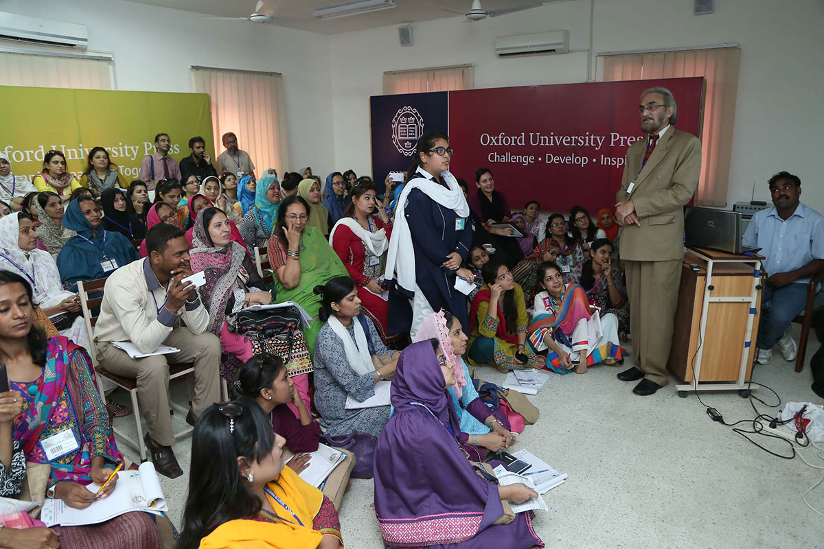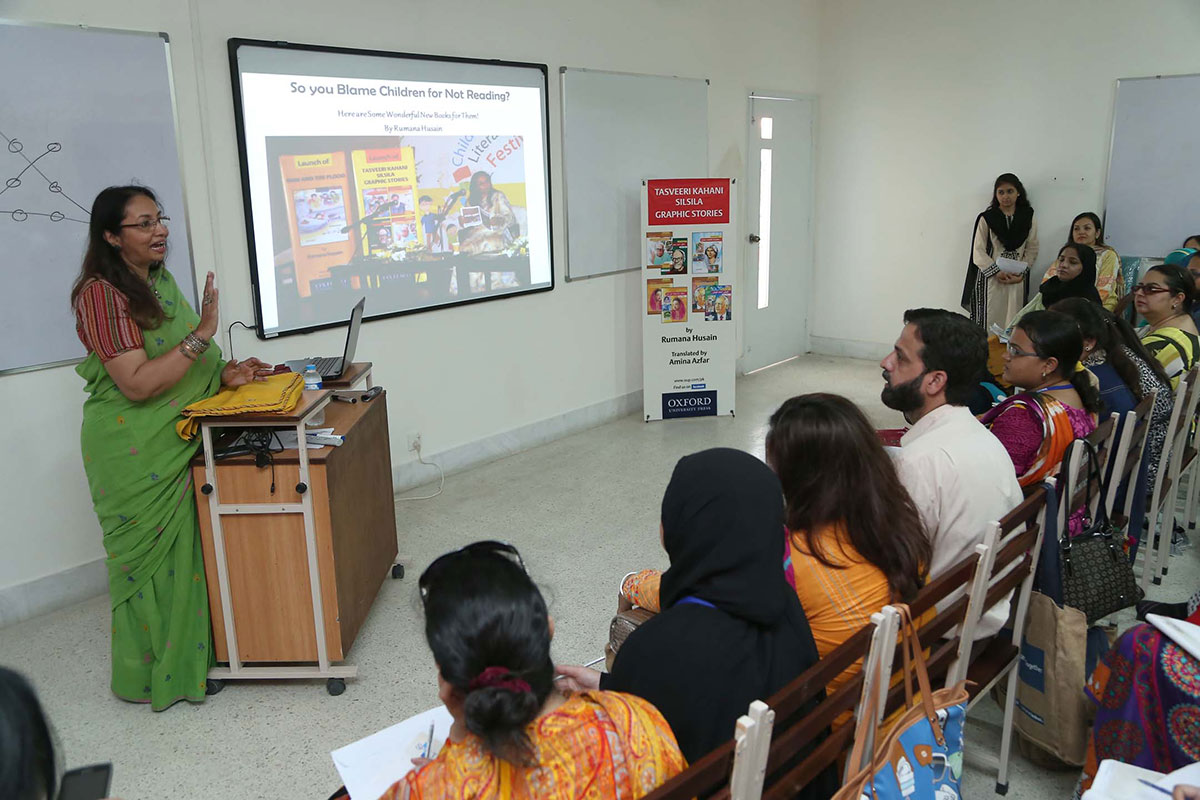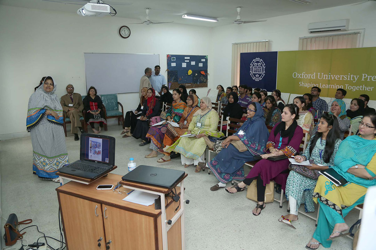 The photograph shows Arwa Khuzaima conducting a workshop on 'Integrated Approach to Literacy Teaching' which was based on the textbook series Nelson English Skills published by OUP. Arwa Khuzaima has over 26 years of experience in teaching both in Pakistan and abroad. She also works as a trainer with many leading institutions.